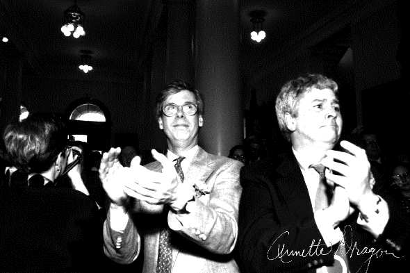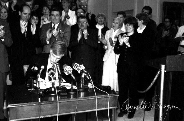 With a loud voice driven by his sincere beliefs, he declared "We have enemies in Maine. They are poverty . . . disease . . .and ignorance. They are not gay people!" It was a wonderful speech, delivered uncharacteristically from notes. It captured the significance and power of the moment. The moment of the signing was lost in the last round of exuberant applause. We just cheered all the more. |