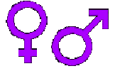 Somewhere in all this excitement with gay and lesbian symbols, bisexuals appear to have slipped through the cracks. It has only been within the last decade or so that bisexuals have begun actively organizing and fighting for equal voices. One of the many good things to come out of this movement is a symbol that bisexuals can call all their own: the interlocking pink and blue triangles, sometimes referred to as the "biangles." Unfortunately, in contrast to most other pride symbols, the exact origin of this symbol is quite mysterious. I have polled a great number of national and international bisexual and gay/lesbian/bisexual organizations, but nobody has been able to give me a definitive source. The pink triangle is obviously taken from the gay symbol. The blue triangle was never used by the Nazis. It may have been added as a foil for pink- pink for girls and blue for boys (because bisexuals have attractions to both), with the overlapping purple triangle (purple has always been a very prominent color in te gay pride movement) representing the middleground that bisexuals fall into. I've also heard it explained that the pink triangle represent homosexuality while blue represents heterosexuality. Thus the overlap between the pink and blue triangles is the purple triangle of bisexuality. All these are personal explanations that I've gathered through Email, so if anyone has their own opinions or suggestions, I'd love to hear them. Male, Female, and Heterosexual
