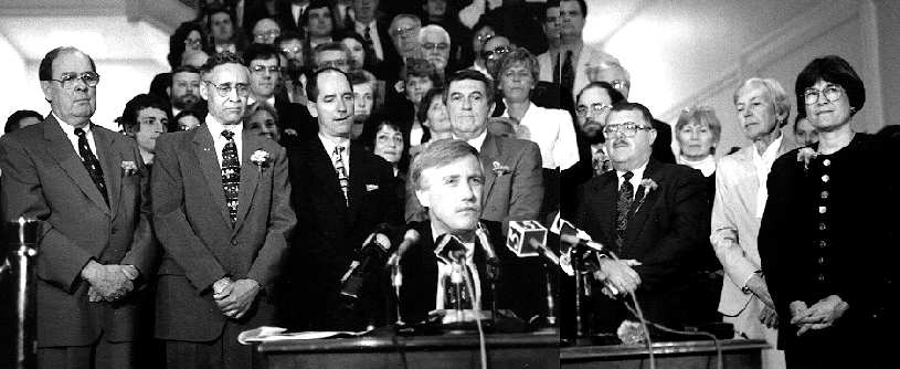 This is a historic day for a vigorous and self-confident society. And I will tell you why. I will tell you why in a few minutes, but first I want to introduce the people who are behind me. All the way behind on the stairs are members of the 118th Legislature who passed this bill. But immediately behind me are a group of individuals who represent a 20 year continuum of commitment to an idea and an ideal. And I want to introduce them in the order in which they have been identified with this issue.